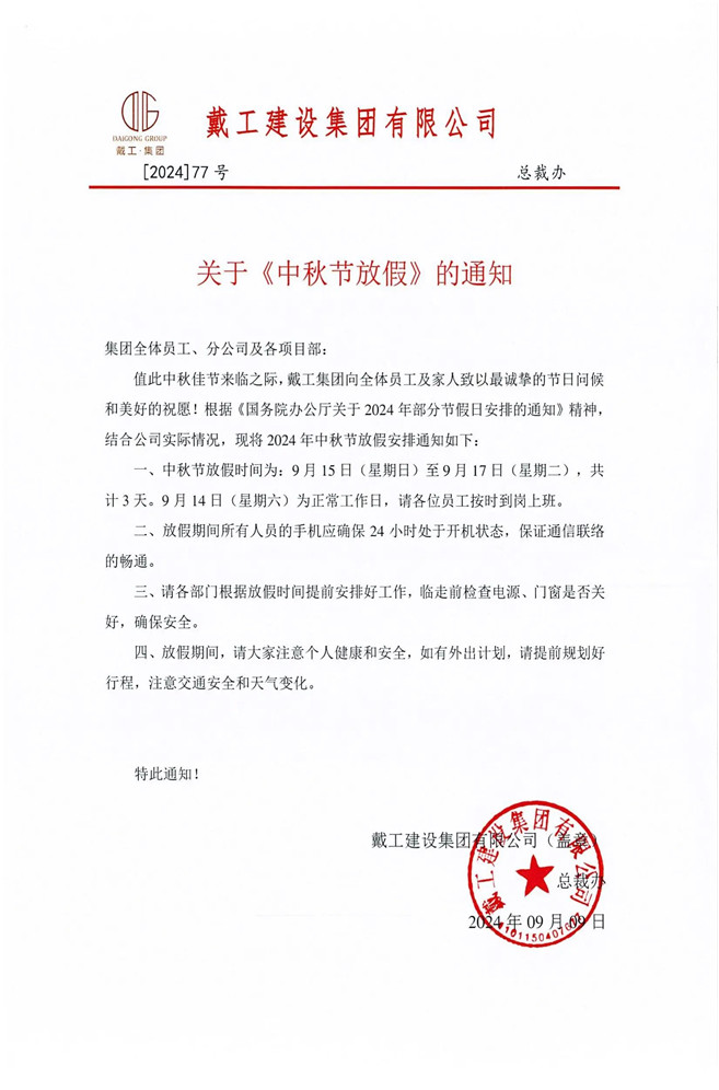 在此,戴工集團(tuán)再次向全體員工及家人致以最誠摯的中秋祝福!愿大家在這個團(tuán)圓的日子里與家人共度美好時光,同時也期待大家以更加飽滿的熱情和充沛的精力投入到后續(xù)的工作中,共同推動公司的發(fā)展邁上新的臺階!